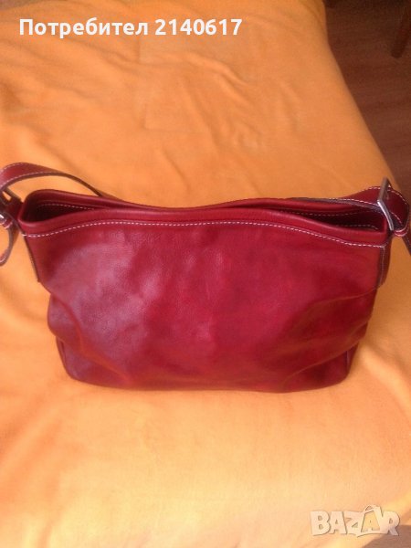 Италианска чанта от висококачествена телешка кожа в красив вишнев цвят,подчертан от бели шевове.Има голям вътрешен джоб с цип,закопчаване-магнит.Размери:висока-29см;широка-42см;дъно-10,5см;дължина на дръжка-58см,с възможност да стане 50см.Няма следи от употреба по кожата и хастара.С преглед и тест.