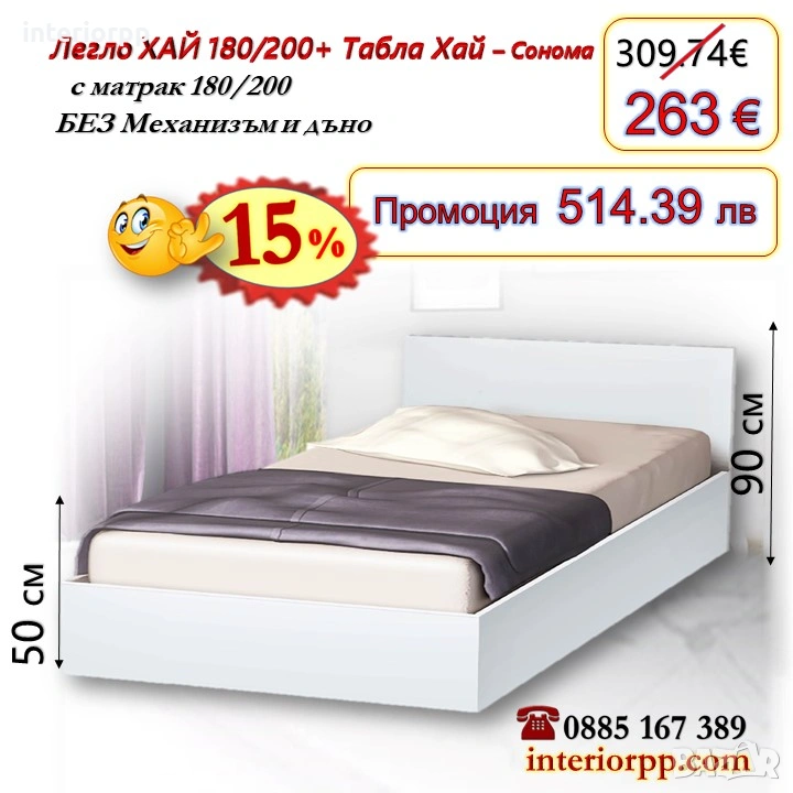 15% Промоция на Легло спалня ХАЙ с табла Хай БЯЛО с матрак 180/200.