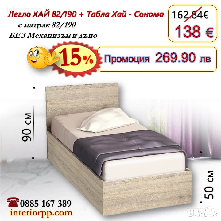 15% Промоция на Легло ХАЙ с табла Хай Бяло ПДЧ с матрак 82/190