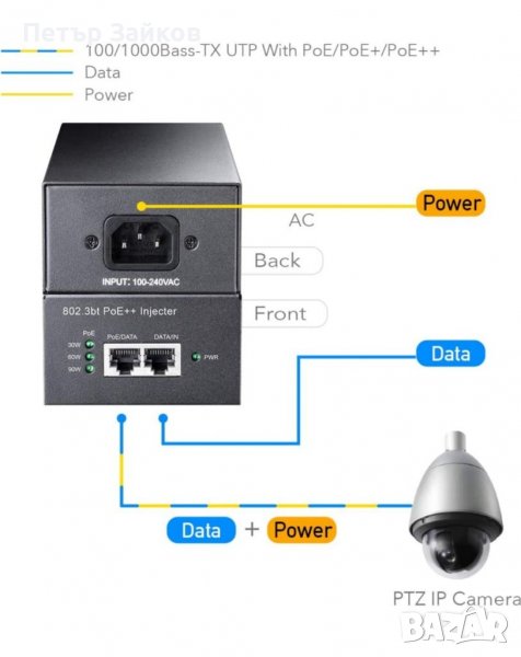 Преобразува не-PoE Gigabit порт в PoE / PoE+ / PoE++ Gigabit порт и свързва в мрежа PoE устройство, намиращо се на разстояние до 100 метра (328 фута).