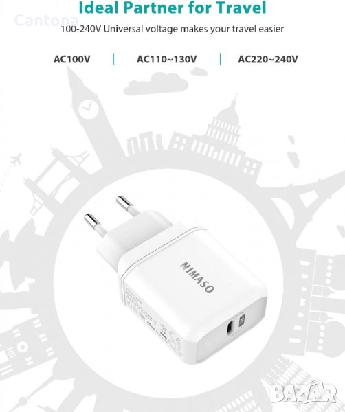 USB C захранването е съвместимо с почти всички мобилни устройства.Поддържа PD3.0/2.0, QC 3.0/2.0, FCP, AFC, Apple 2.4A.18W бързо зареждане за iPhone 2/12Pro/12mini/12ProMax 11 pro/11 pro max/XR/XS max/X/8/8plus , Ай Пад.pro/Air3/mini5,Samsung Galaxy S10+/S10/S10e/S9/S8/Note 9/Note 8/A80/A50, Huawei P30 pro/P20 pro/Mate 20 pro/Mate 10/Mate9/Honor V20/Honor 20 pro , Google Pixel/Redmi Note 7.