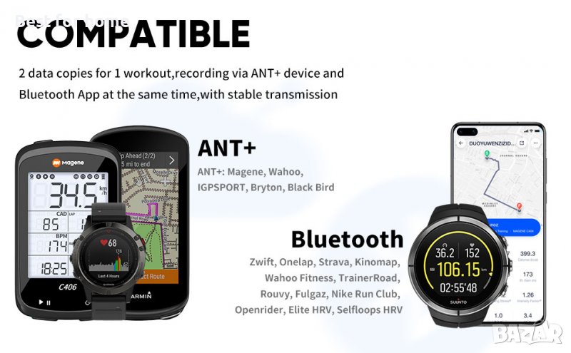 Съвместим с ANT+&Bluetooth: 2 копия на данни за 1 тренировка, запис чрез ANT+ устройство и Bluetooth приложение едновременно, със стабилно предаване. ANT+: Magene, Wahoo, IGPSPORT, Bryton, Black Bird. Bluetooth: Zwift, Onelap, Strava, Kinomap, Wahoo Fitness, TrainerRoad, Rouvy, Fulgaz, Nike Run Club, Openrider, Elite HRV