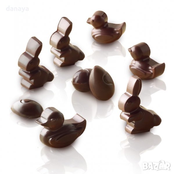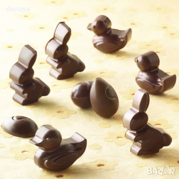 Форма за шоколадови бонбони Великден. Тавичката съдържа 14 гнезда с форма на зайче, великденско яйце, пате. Силиконови форми за бонбони, дребни сладки, кубчета лед, фондан, желирани бонбони, шоколадови бонбони. Идеални са за декорация на различни сладкиши, торти и десерти.