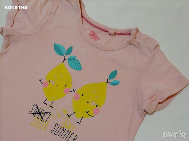 На 11 и 12 снимка блузка с лимони по етикет за р.86/92см, дължина 39см, широчина 30см. Има леко белеещо близо до деколтето (снимала съм). Цена 2лв.