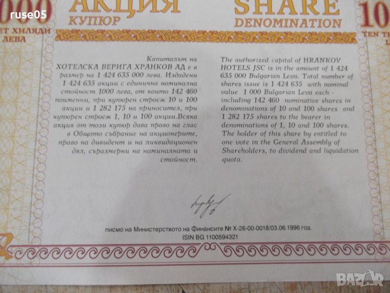 Акция „ХРАНКОВ–ХОТЕЛСКА ВЕРИГА“ АД-10000 лева /10х 1000 лв. → Обява 40057411
