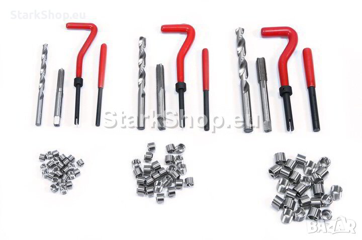 Комплект за възстановяване на резби съдържа 88 елемента и е предназначен за възстановяване на резби M6, M8 и M10 за свещи, резби на пробките за масло и др.