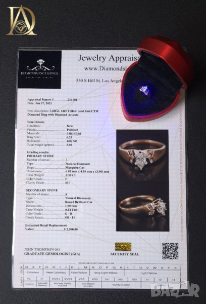 - Два броя сертификати - оценителен доклад на бижуто направен в Лос Анджелис на стойност 2500$ и цялостен лабораторен анализ за естествения произход на диамантите направен в България.