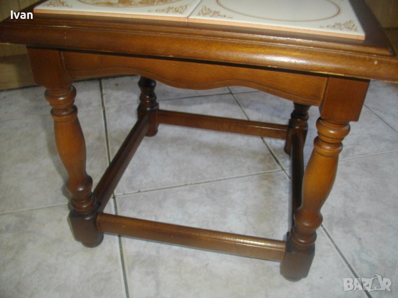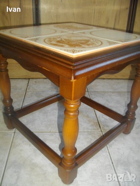 Почти нова, в отлично запазено състояние, без забележки, малка и много удобна, елегантна помощна масичка с флорални елементи по дървесината и горен плот от керамични декоративни плочки.