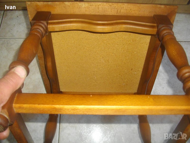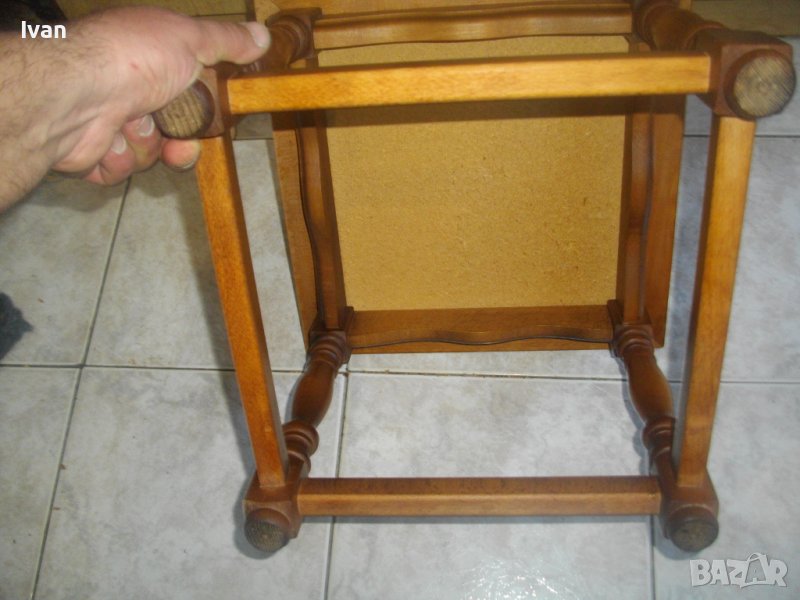 Стабилна конструкция със струговани крачета, релефи по рамката и плочки с флорални мотиви за плота.