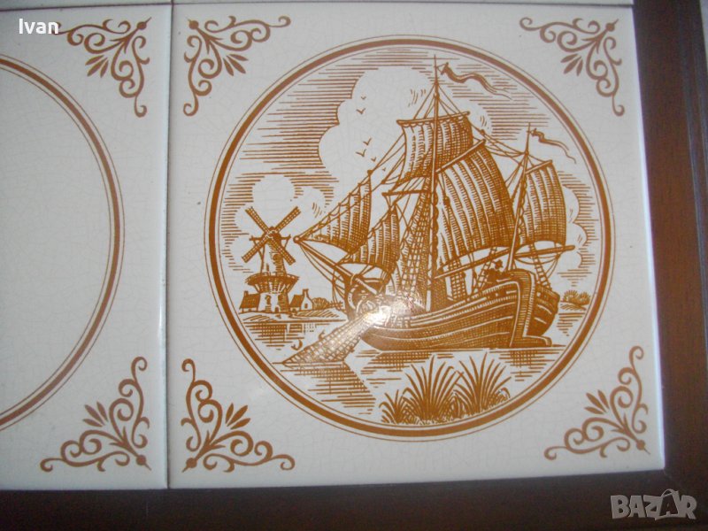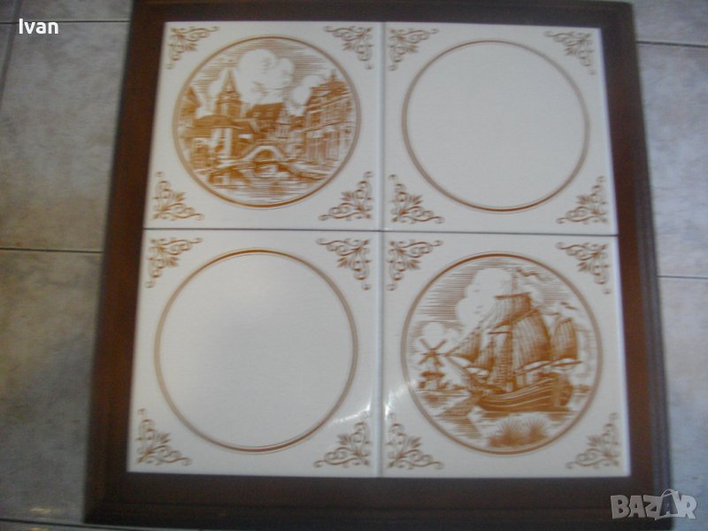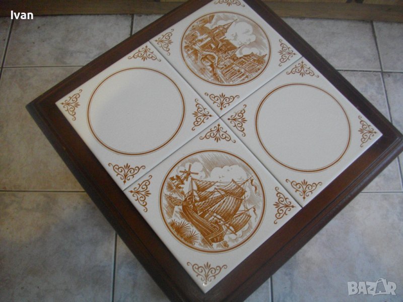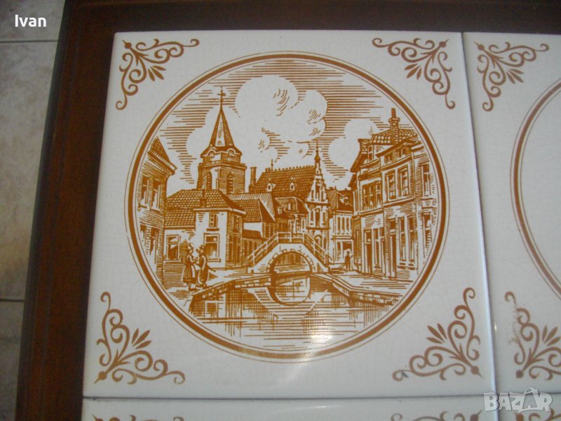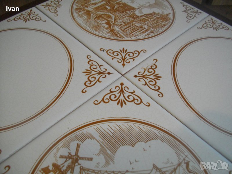 и Четирите декоратини плочки са в идеално състояние, без чипове и без напукване на глазурата. Изображението на едната е нидерландски град с мост над река, църква с висок купол, високи двуетажни къщи. Другата плочка е с изображение на нидерландкска вятърна мелница в далечина, а в близък план е показан нидерландски плавателен съд/кораб - фрегата или корвета. Другите две декоротивни плочки са с голям кръг с три линии. И четиритте плочки са с фларални елементи, в един и същи цвят - цвета на дървото на масичката - дъб.