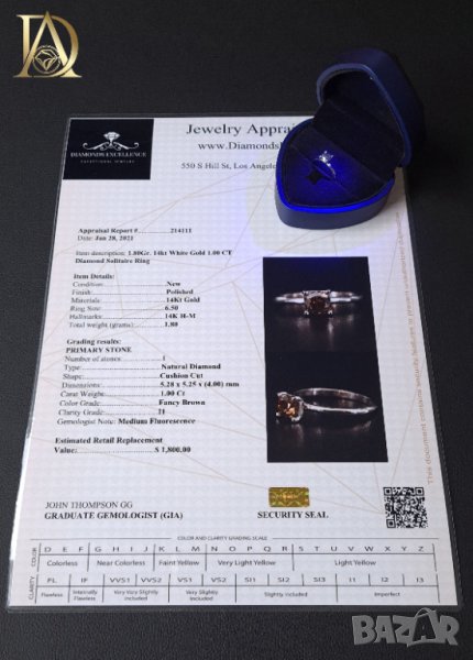 - Два броя сертификати - оценителен доклад на бижуто направен в Лос Анджелис и цялостен лабораторен анализ за естествения произход на диамантите направен в България.