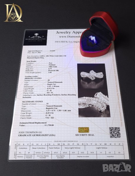 - Два броя сертификати - оценителен доклад на бижуто направен в Лос Анджелис и цялостен лабораторен анализ за естествения произход на диамантите направен в България.