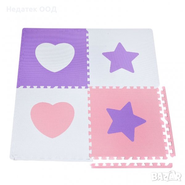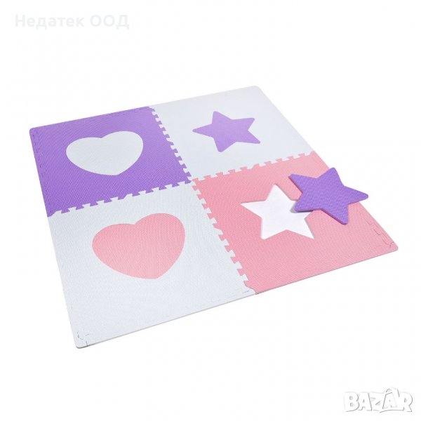 Подов пъзел с меки цветни части в бяло и розово, които пасват заедно като пъзел и създават удобна повърхност за безопасна детска игра.С форми на сърца и звезди, които забавляват детето.