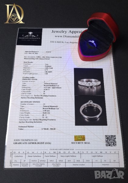- Два броя сертификати - оценителен доклад на бижуто направен в Лос Анджелис и цялостен лабораторен анализ за естествения произход на диамантите направен в България.