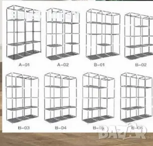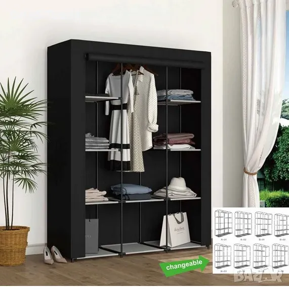 Гардероб от текстил, трикрилен, сгъваем, етажерка, закачалка, рафт
