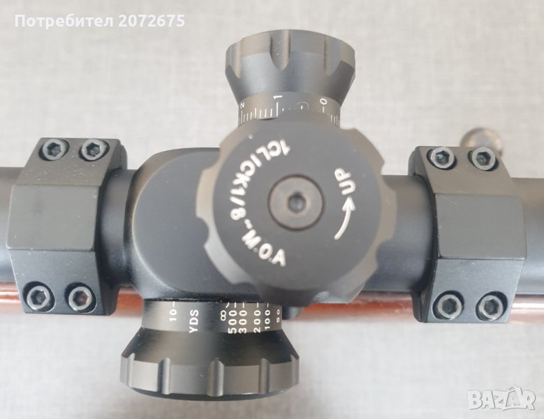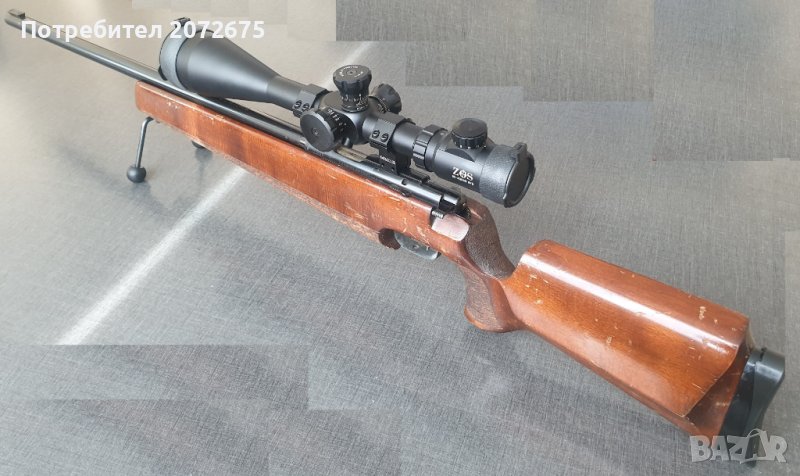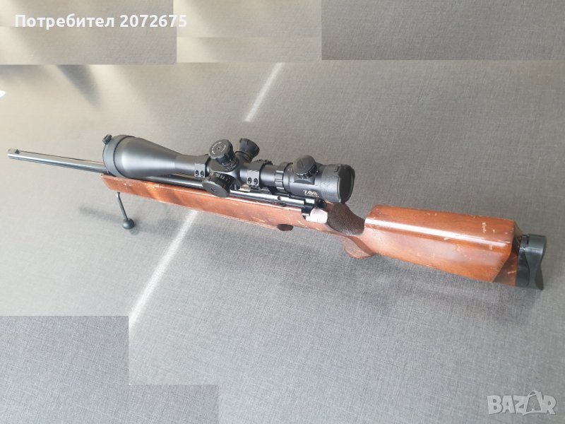 пушка Anschutz Match mod. 54 в калибър .22LR с монтирана на нея оптика ZOS 10-40x60 SFE. Ринговете са алуминиеви и бяха осигурени от производителя конкретно за този модел пушка.