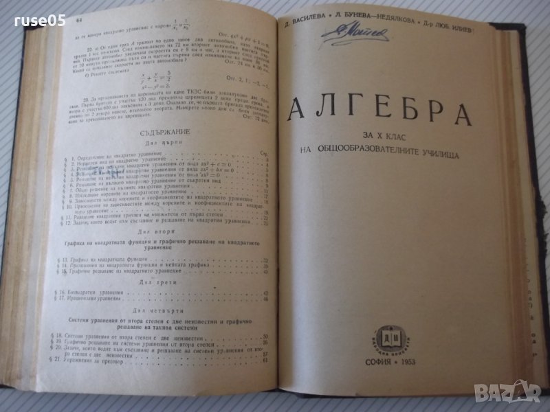 4. Алгебра за X клас на общообразователните училища - 96 стр. - 1953 г. - Д. Василева / Л. Бунева-Недялкова / д-р Люб. Илиев