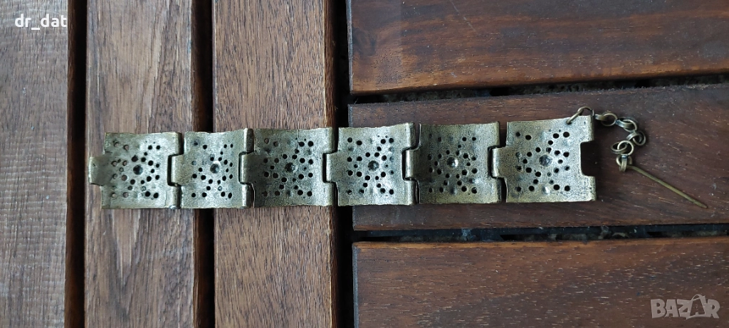 Много интересна гривна от множество метални елементи. Всчико по нея е здраво и няма липси. Предполагам, че е производство на СБХ и е произведена преди 1990 година. Изглежда е от масивен бронз.