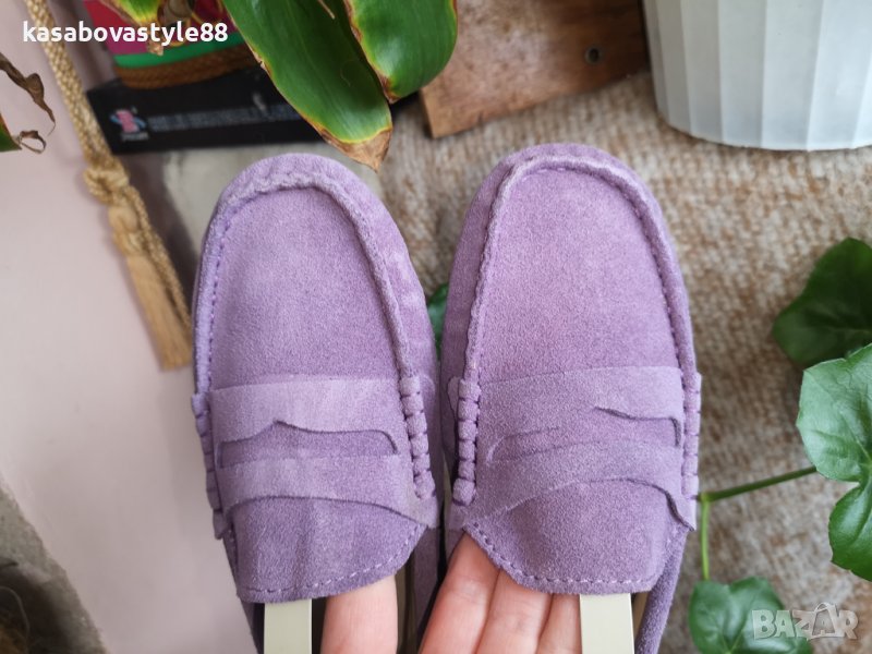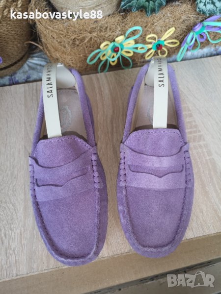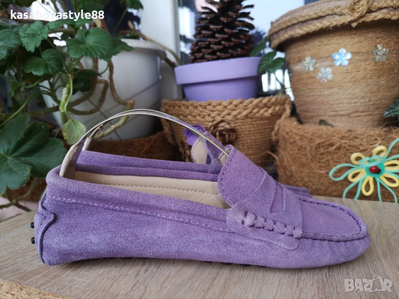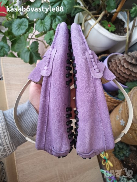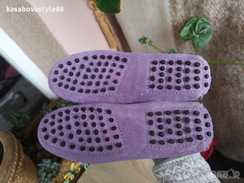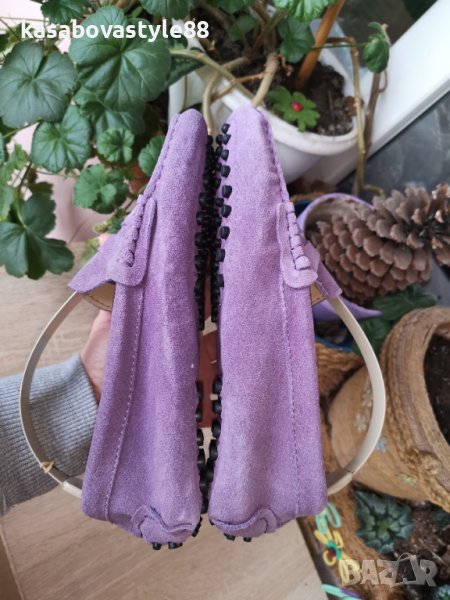 Дамски лилави мокасини от естествен велур и естествена кожа отвътре. Обувани веднъж, само за проба. Неразличими от нови!! Много стилен модел, съчетан с качество и комфорт. Дължина на стелка 2.5см.Отзад са високи 5.5см.