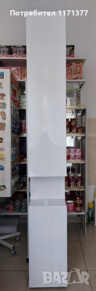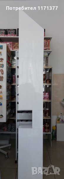 Стелажът е изработен от поцинкована ламарина с дебелина 1мм., подсилен с квадратни профили (10x10mm), прахово боядисан. Разполага със специален отвор в задната част, на височина от земята: 65см. Пригоден е за оползотворяване на пространството зад мивка/умивалник. Отворът е с размери: височина: 22см; широчина: 30см., дълбочина: 17см. Използван е за продажба на козметика. Изключително здрав, лек, мобилен и надежден. Много запазен.