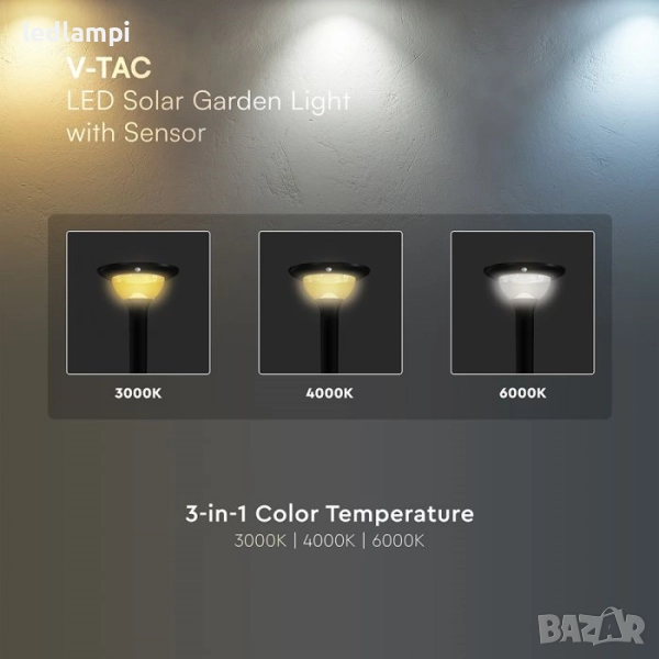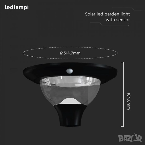 Соларно LED градинско тяло Мощност: 15W Вид: Соларен Панел 8.5W, 5V, Mono Материал: ABS+PC Капацитет на батерията: 3.2V, LiFePO4, 12000mAh Време на зареждане: 7 часа Работно време: 70 часа /max/ LED Тип: SMD2835 Брой LED: 160 бр. Степен на защита: IP65 Светлинен поток: 2 200 lm Ъгъл на светене: 360° Цветна температура: CCT 3в 1 Топло Бяла 3000К , Неутрално Бяла 4000К или Студено Бяла 6400К /по избор / Цвят на тялото: Черен Тип Сензор: Radar Sensor Режими на работа: *Режим на осветление (Save Lighting Mode) *Режим на сензор (Sensor Mode) Обхват - разстояние: < 8 m Височина на монтаж: 2-3 метра Работна среда: от -20° до +60° Сертификати: CE, EMC, ROHS Размери: Ø324.7 x 184.8 mm Тегло: 2.95 кг.