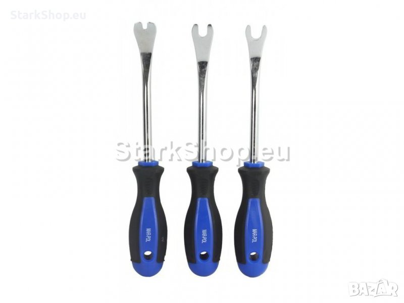 Професионален комплект вилки / инструменти за вадене на щипки 6 части Mar-Pol. Лостове за скоби за тапицерия за лесно отстраняване на щифтове за тапицерия, вътрешни капаци и щифтове за закрепване. Специалната форма на върховете предотвратява всякакви повреди. Грайферите са с гумени дръжки.