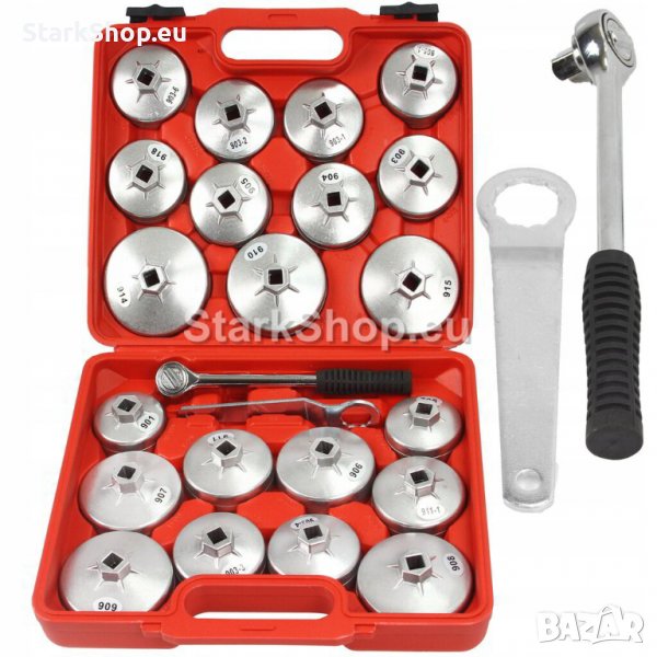 Професионален комплект за маслени филтри 23 части Mar-Pol. Удобният куфар съдържа 23 елемента, изработени от алуминий, включително специална тресчотка и гаечен ключ за развиване.