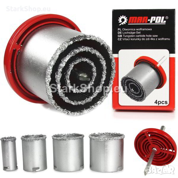 Професионален комплект диамантени боркорони 4 части MAR-POL включва дръжка и пилотно свредло. Волфрамовото покритие улеснява пробиване в различни видове строителни материали, включително керамични плочки.