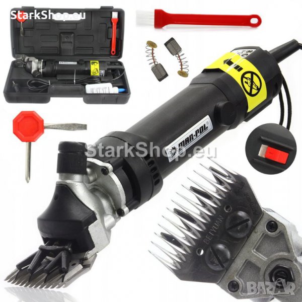 Професионална електрическа машинка за подстригване на животни Mar-Pol Електрическа машинка за подстригване, предназначена за овце, коне, говеда и други животни с дълга или гъста козина. Устройството е оборудвано с изключително ефективен 650W двигател. Уредът има плътно затворен корпус, защитен срещу проникване на прах, мръсотия и животински косми. Главата е изработена от изключително лека и издръжлива алуминиева сплав.