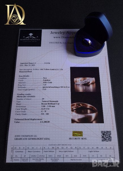 - Два броя сертификати - оценителен доклад на бижуто направен в Лос Анджелис и цялостен лабораторен анализ за естествения произход на диамантите направен в България.