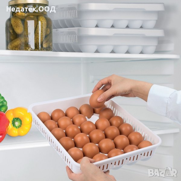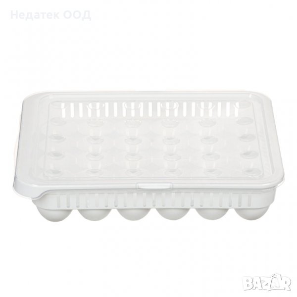Бяла пластмасова кутия за яйца с 0% BPA с прозрачен капак, който се затваря сигурно и вентилационни отвори по периметъра. Използвайте го за безопасно съхранение на яйца в шкафа и хладилника. Подходяща е за замразяване.