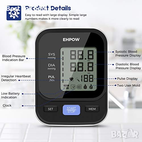 【Наблюдавайте здравето си надеждно】Апаратът за кръвно налягане на горната част на ръката разполага с усъвършенствани техники за измерване, които ви дават не само метод за бързо отчитане, но и по-точни резултати. Дисплеят с удобен за потребителя интерфейс с големи числа улеснява навигацията в монитора и разбирането на систоличното налягане, диастоличното налягане, честотата на пулса и нередовния сърдечен ритъм.