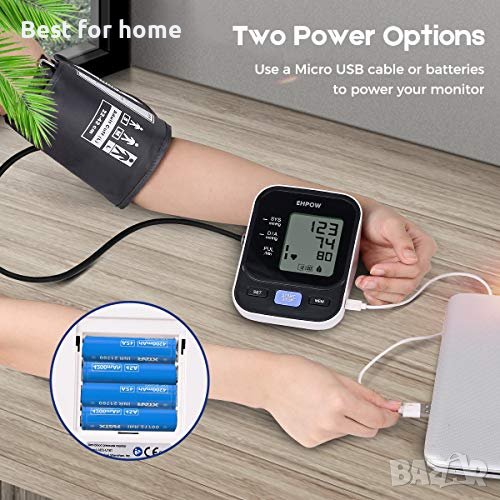 【Операция с едно докосване】Апаратът за кръвно налягане е напълно автоматичен, просто трябва да натиснете един бутон "Старт", за да измерите кръвното си налягане и сърдечната честота, супер лесно и удобно за домашна употреба. Захранва се с 4 AAA батерии (не са включени) или е свързан към USB (не са включени). Цифровият тестер за кръвно налягане ще се изключи автоматично, ако не се използва за 60 секунди, за да пести енергия.