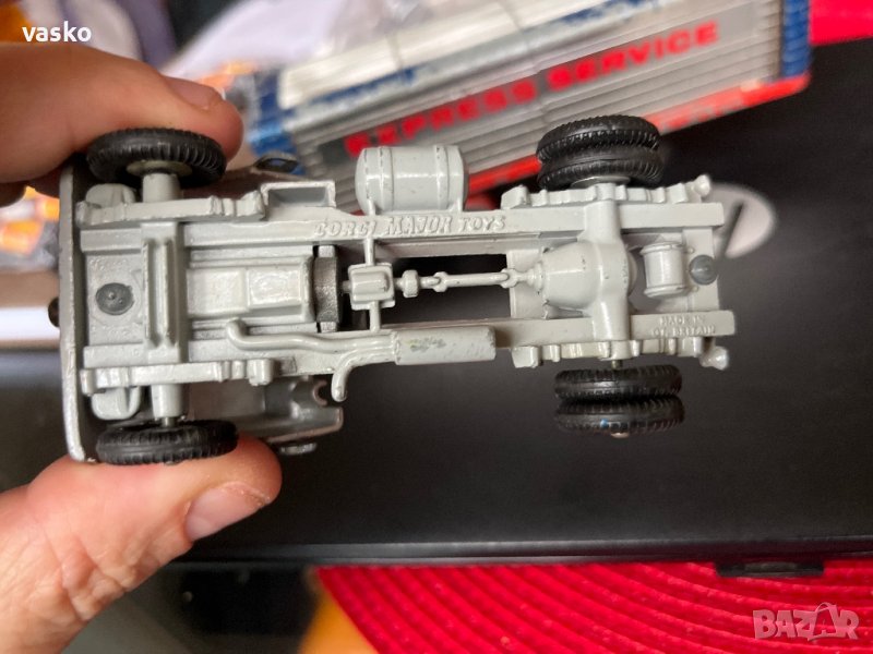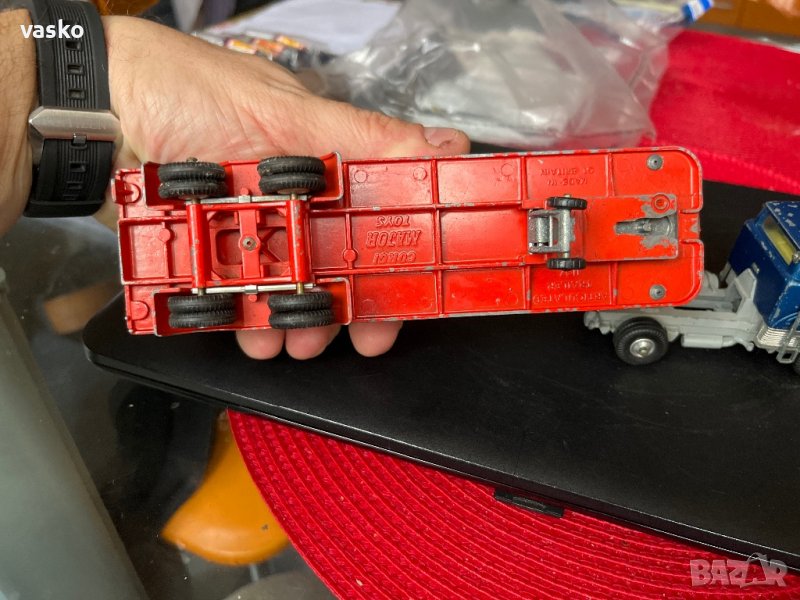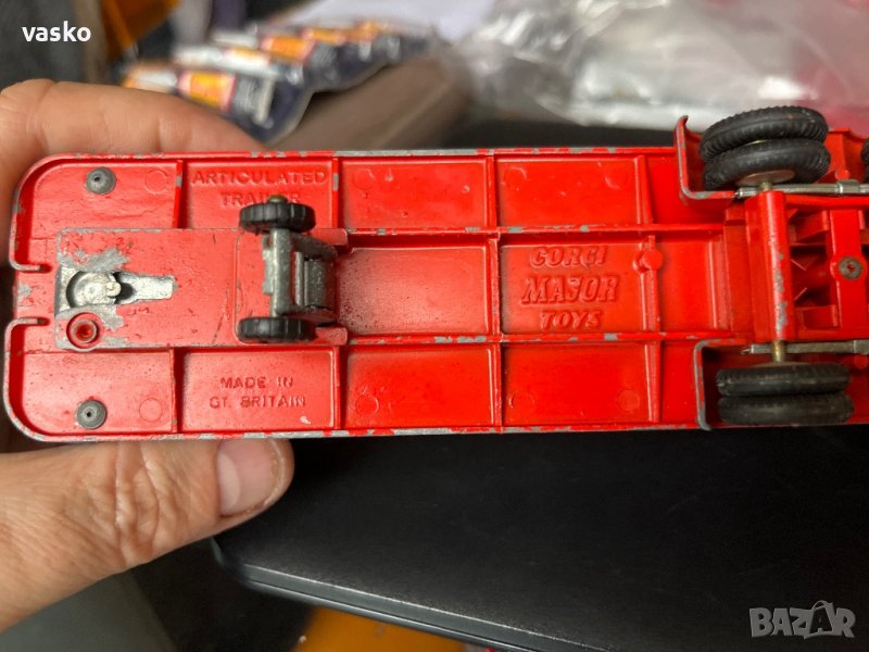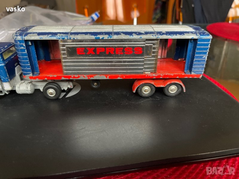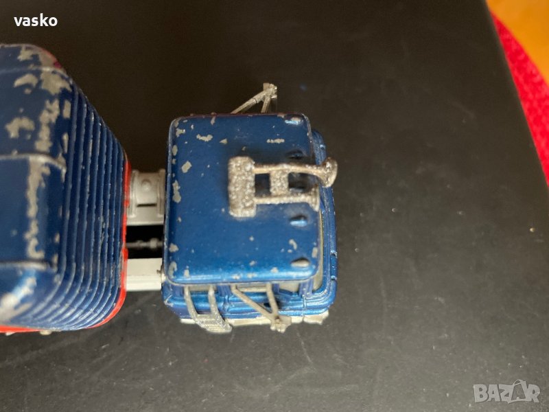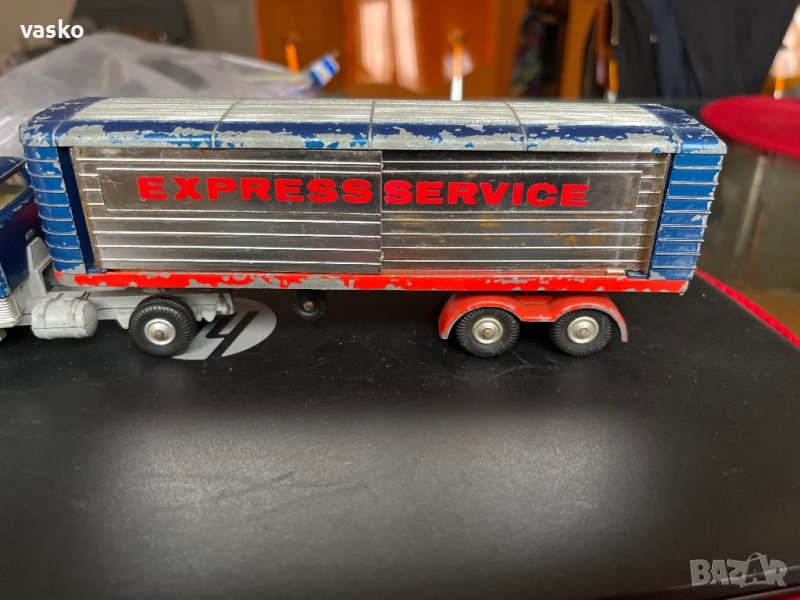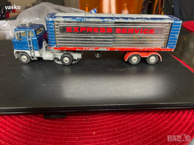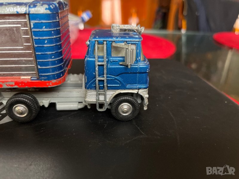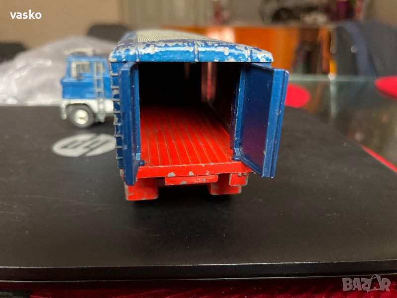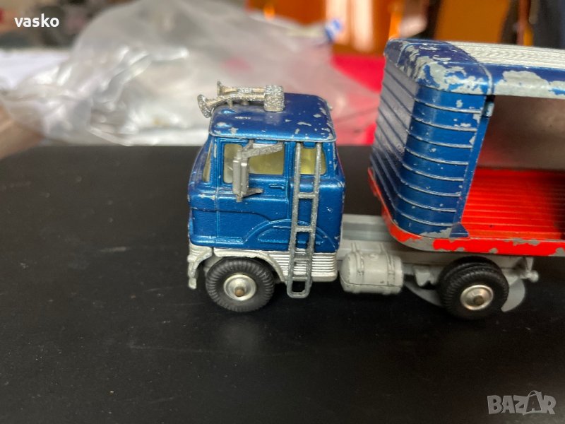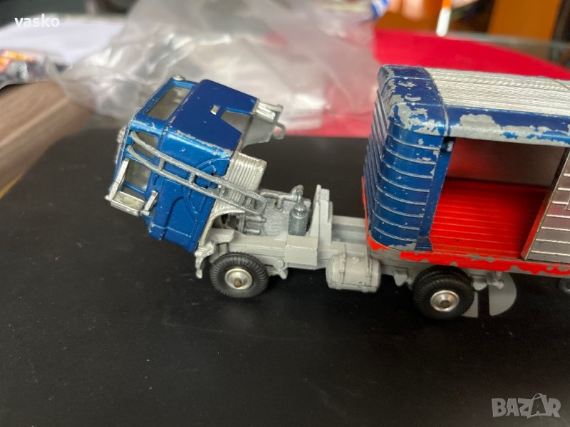 Много стар и рядък модел Английско Корги,голям,масивен и много тежък,здрав,кабината пада,страничните врати от двете страни на ремаркето както и задните се отварят,като се откачи влекача се изправят допълнителни колелца и ремаркето стои отделно.Всичко е оригинално и здраво,следи по боята.Около 1:43,много стар-период според мен около 1960-1970.Много рядък камион за намиране дори и в това състояние.