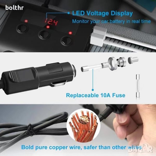 Качествен разклонител за запалка с вграден волтметър, 3 гнезда и 4 USB порта