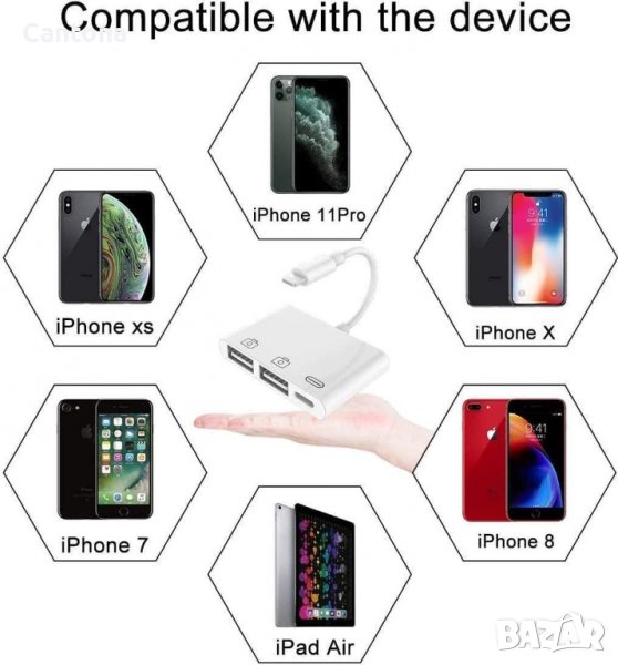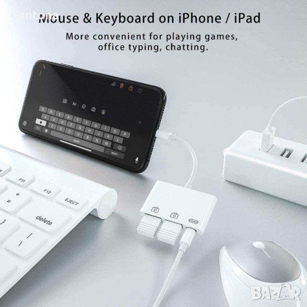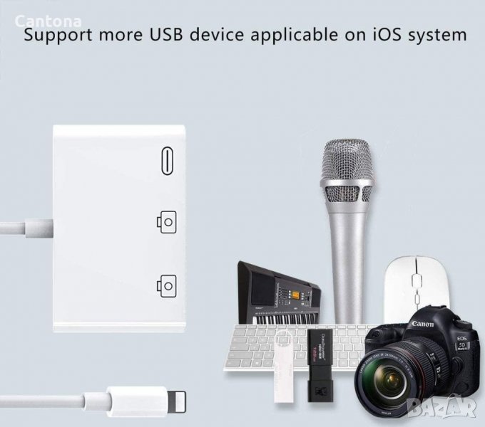 3-в-1 двоен USB женски OTG адаптер поддържа два USB порта, работещи едновременно. Можете да свържете клавиатурата и мишката си към вашия iPhone/iPad едновременно. Можете да прехвърляте снимки и видеоклипове от вашия USB цифров фотоапарат / USB флаш устройство към вашия i-Phone / i-Pad с този адаптер. Отличен избор за копиране на снимки или видеоклипове на камерата за кратко време.