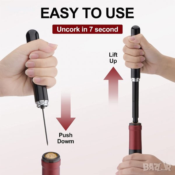 Лесен и бърз начин да отворите бутилка вино. Помпате няколко пъти и тапата е извадена без повреда на корка.