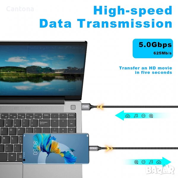 5Gbps трансфер на данни с Type-C към USB 3.0 кабел, 10 пъти по-бърз от USB 2.0 (480Mbps).Може да синхронизира вашите любими снимки, видеоклипове и музика със скорост на трансфер на данни до 5Gbps (625Mb/s).Файловете могат да се синхронизират за минути.