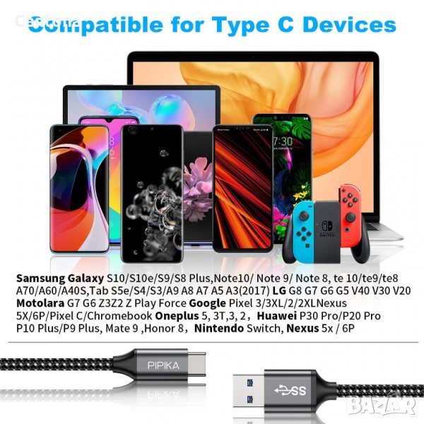 Кабел PIPIKA USB C 3.0 е съвместим със Samsung, Huawei ,Xiaomi, Oneplus, Realme, Google Pixel, Microsoft, Honor, LG, Motorola, Sony Xperia, Vivo, Redmi, Oppo и други USB-C устройства.