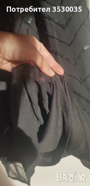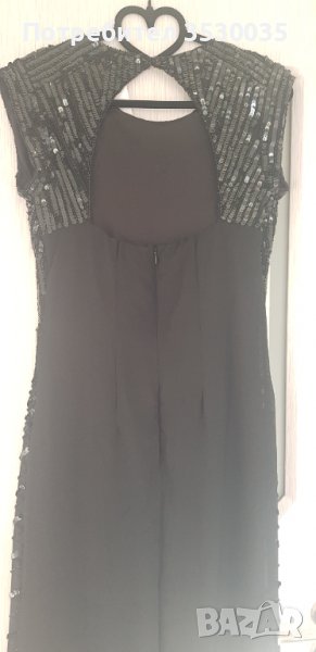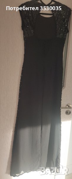 Материята е шифон, богато украсена с пайети в горната част, с дълга подплата. Закопчаване на гърба с цип (работещ).