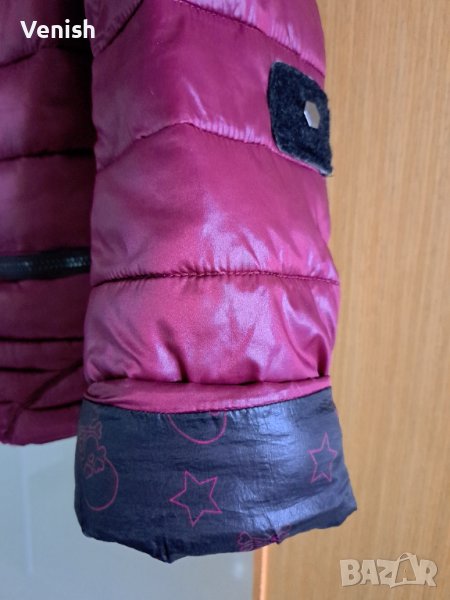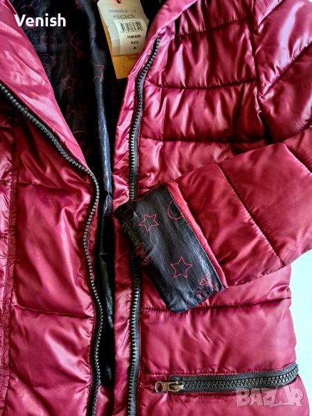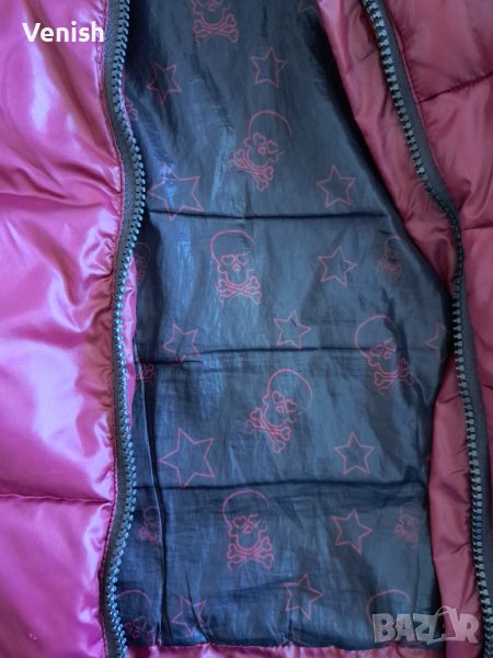 Много сладко яке във винено червен цвят, леко асиметрично закопчявоне подплатата е на черепи и звездички.По размер е М, но е умалено.За слабо момиче, размер S е по-скоро. Реалния цвят е на първите три снимки..