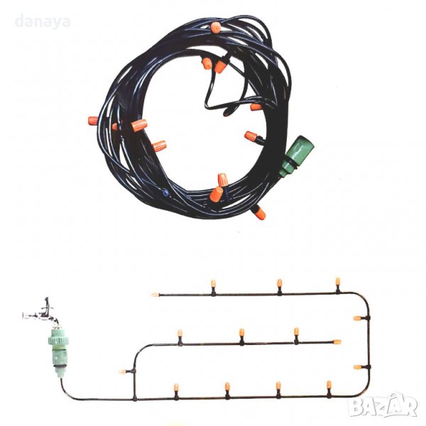 Маркуч с дюзи за водна мъгла. Системата за охлаждане е предназначена изцяло за външна употреба. Работи на принципна на разпръскването на фина мъгла от студена вода. Това е бърз и лесен начин за намаляване на температурата на тераси, балкони, дворове, градини, външни части на заведения, барове и други. Така създадената изстудяваща завеса може да намали температурата с до 10° C. Също така е ефективен способ за борба с насекоми и мръсотия. Насекомите избягват водната мъгла, защото тя полепва по техните крила. Комплектът е подходящ за овлажняване и филтриране на въздуха, при падането си микрокапките улавят мръсните частици във въздуха и ги свалят на земята. Лесен монтаж, без необходимост от употреба на инструменти.