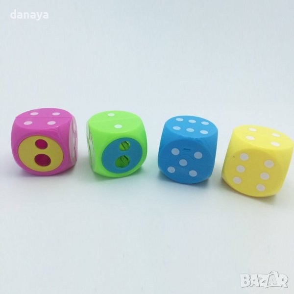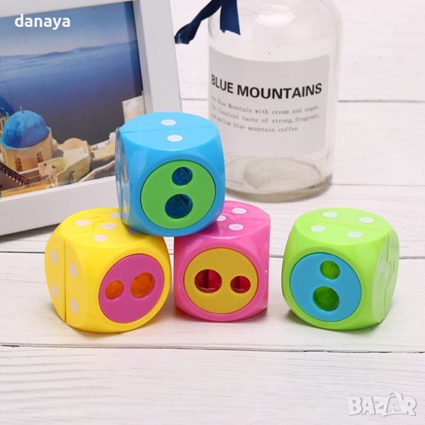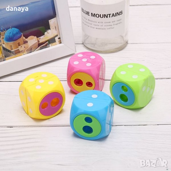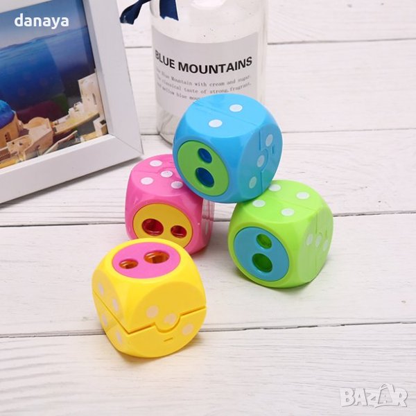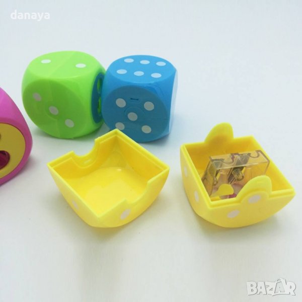 Двойна острилка за моливи с с форма на зарче. Острилката има два отвора за острене на обикновени моливи и за острене на по-дебели моливи. Ярки и свежи цветове – зелен, розов, син, жълт.