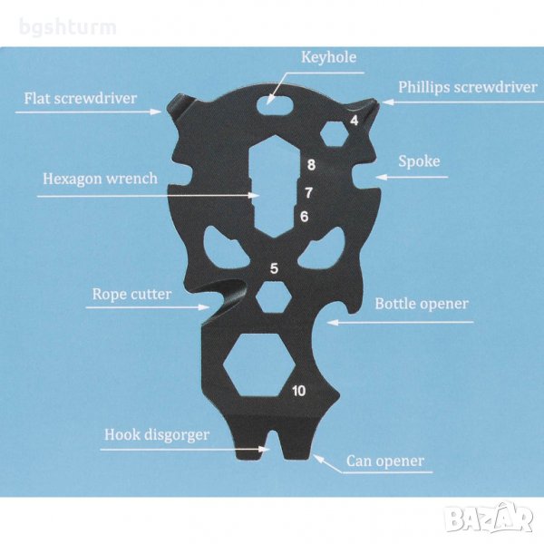 Мултиинструмент ROXON, 9 в 1, черен . Компактен инструмент с форма на череп с:кръстата отвертка , слот отвертка , ключ за спици , винтови ключове в различни размери , резачка за въжета , отварачка за бутилки и консерви , кука дегоргер , дупка за ключодържател .Размери: ок.6,2 х 3,5 х 0,2 см .Тегло: ок.20 гр .Материал: Неръждаема стомана
