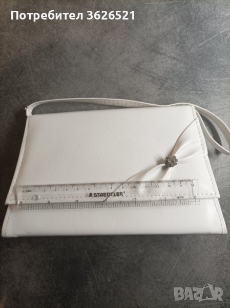 Дамска официана чанта, изработена от синтетичен материал с декоративен елемент. Твърда, с размери 17/20*12*6 см. Закопчаване с тик-так скрито копче. 1 основно отделение. основна дръжа и откопчаваща се допънителна дръжкка. Чантата е носена 3 пъти, но поради това, че е бяла има забележки, видни по снимите - дръжката е прегъната на няколко места и нараняване от задната страна, които не са видими при носене, а само при вглеждане отблизо. Цената е съобразена с дефектите. Чантата е подходяща за официално събитие, би свършила отлична работа за сватба, бал или кръщение. Лично предаване или доставка за сметка на купувача.