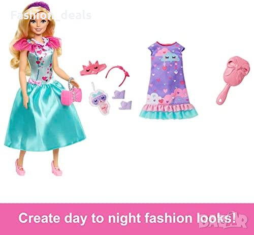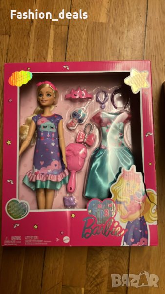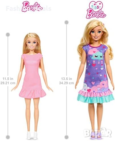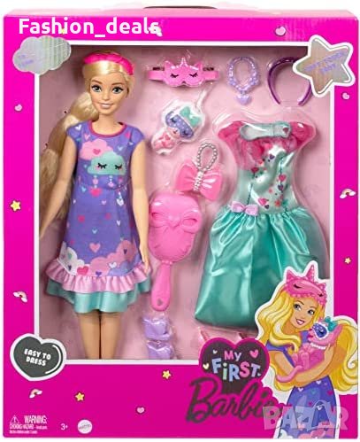 Моята първа кукла Барби „Малибу“ Робъртс се предлага с два модела и много цветни аксесоари, центрирани около две любими на децата теми: отиване на парти или подготовка за лягане