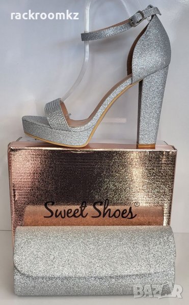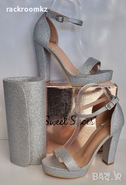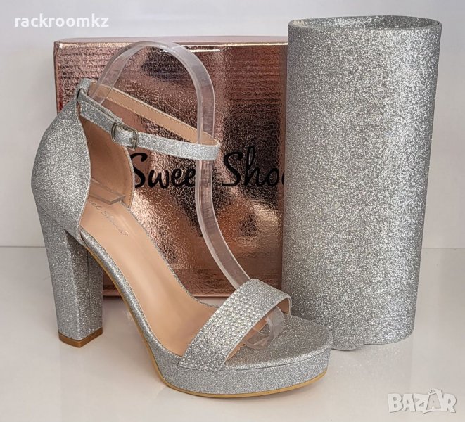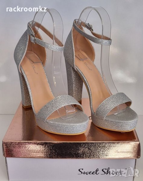 Официални дамски обувки на висок квадратен ток с платформа в сребрист цвят