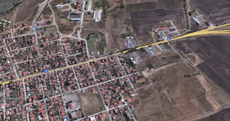 Поземлен имот с лице 35 м на главен път Бургас-Ветрен. Съгласно ОУП парцела попада в смесена устройствена зона с преобладаващо производствено предназначение.