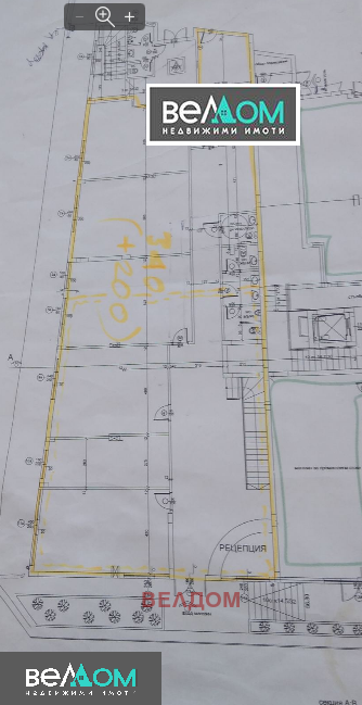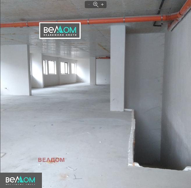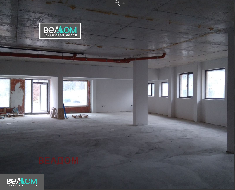 Помещението се състои от партерна част 400 м2 с височина 3,26 м. С големи витрини, светло и приветливо. Изградени са санитарни възли за мъже, жени и инвалиди. С два входа-към главната улица и откъм задния двор.