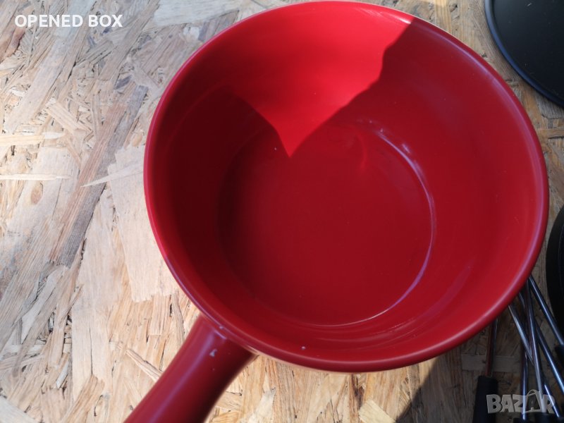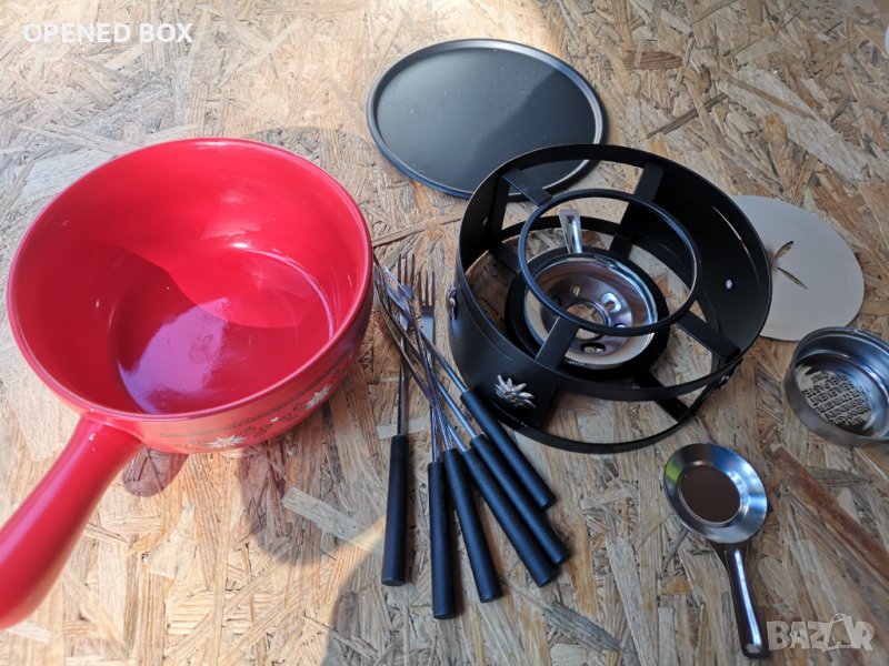 Рустик, с любов декориран фондю комплект за фондю с традиционно швейцарско сирене за безжична работа с горивна паста, състоящ се от: съд за фондю (диаметър 22,5 см, 2,6 литра), горелка за фондю, решо, основна чиния, междинен слой и 6 вилици за фондю